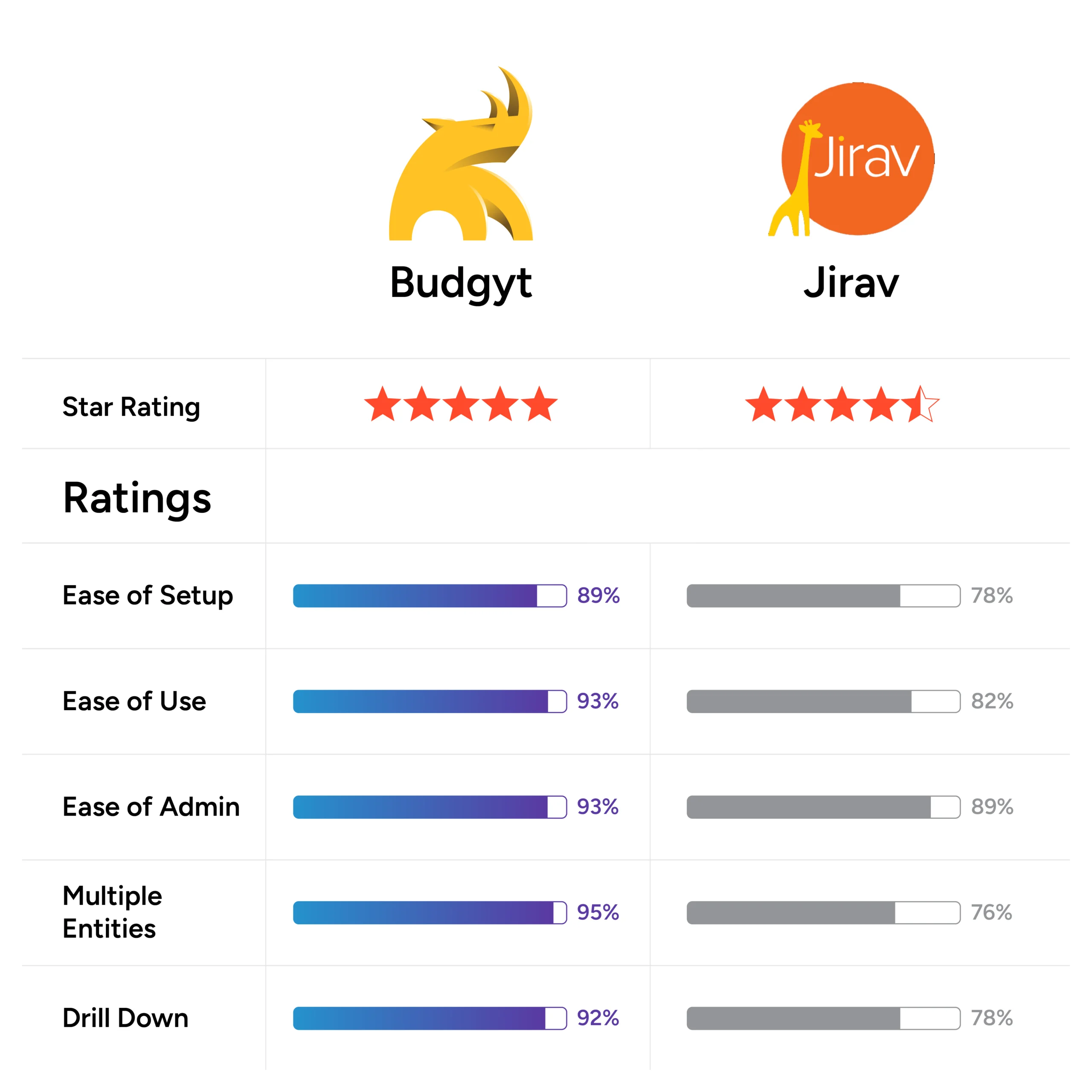 Jirav doesn’t show budget vs actual in one dashboard, forcing you to build separate reports and manually compare numbers. Budgyt’s variance analysis is a core feature.