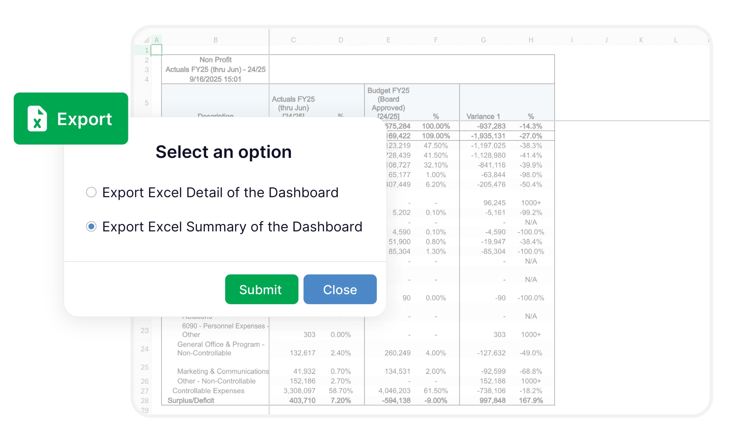 All dashboards export to fully formatted Excel reports for board presentations… if they still insist on .xlsx.