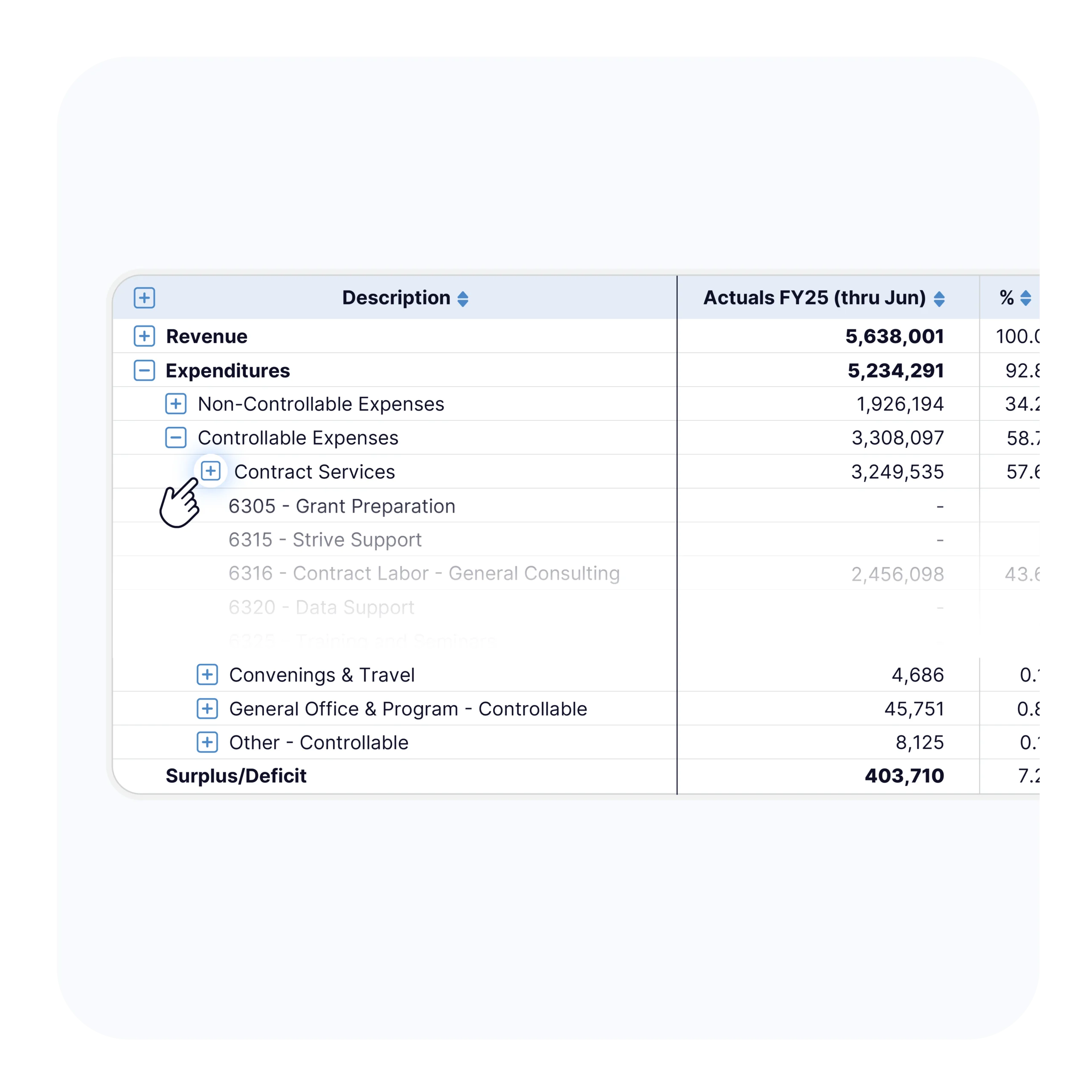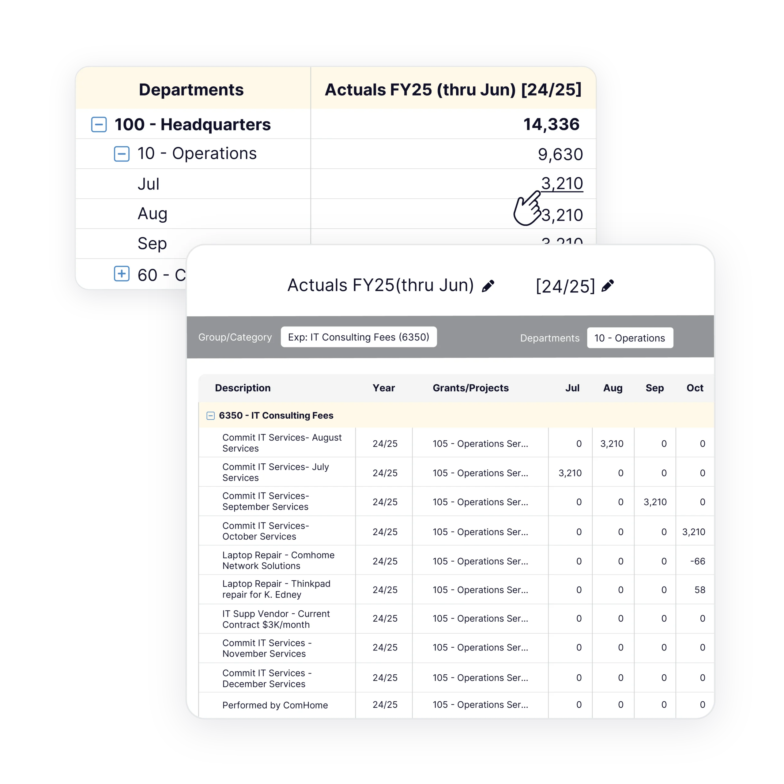 Hierarchical dashboard navigation lets you drill from summary to transaction-level detail instantly. Want to see why Marketing is over budget by vendor or timing by month? Click. Need the specific vendor driving that variance? Click again.