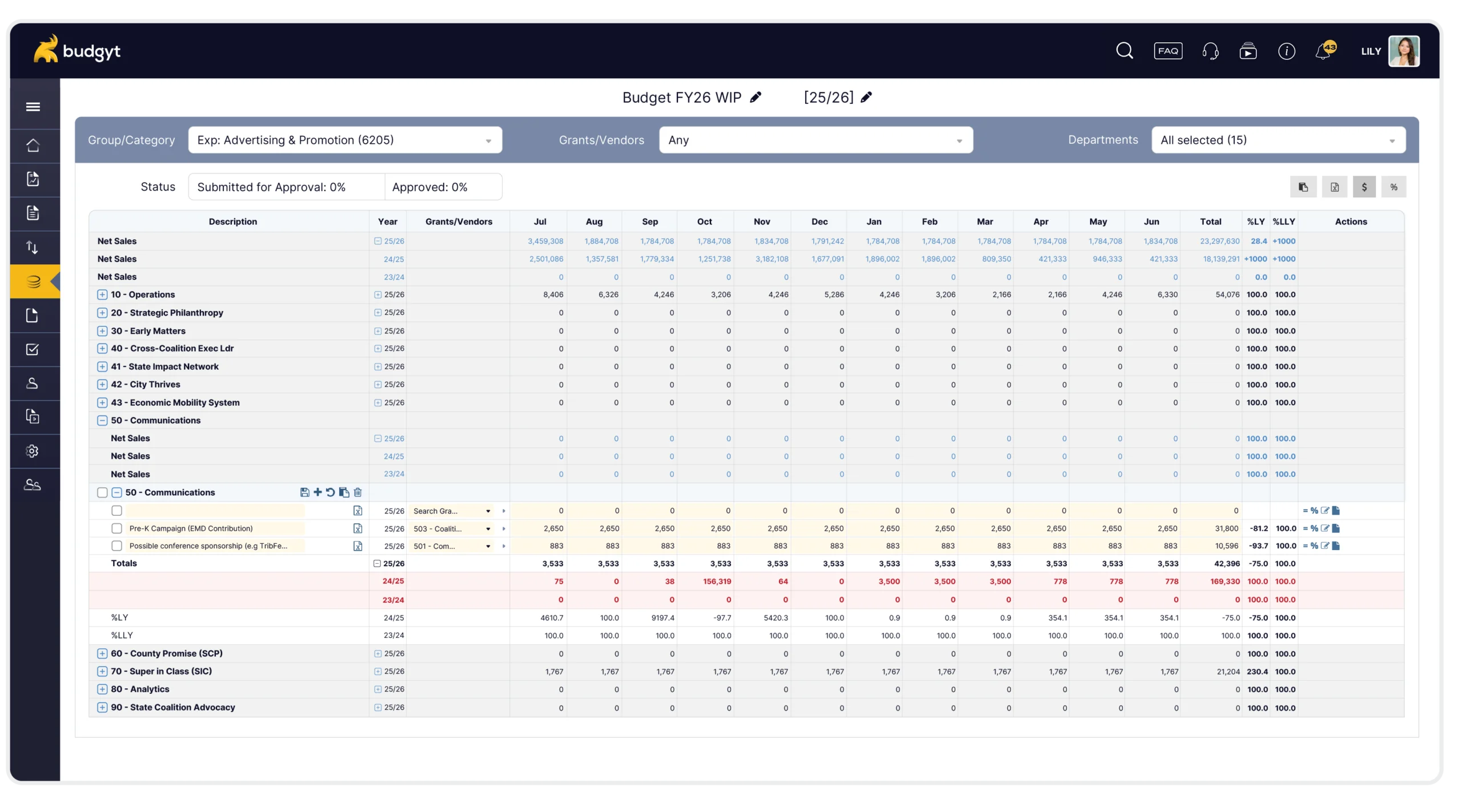 Build, view, and update your entire budget here. Filter by department, drill into line items, adjust numbers. This is where your team lives.